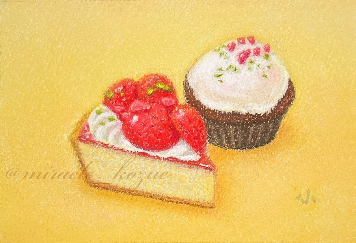 【パステル画】『苺タルトとカップケーキ』(スイーツ絵画)