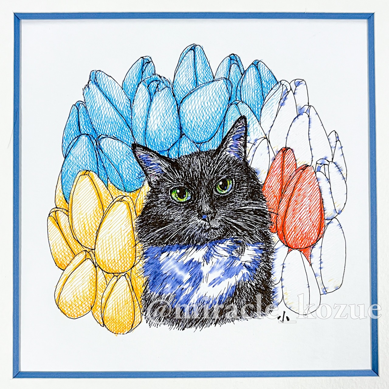 ウクライナに住む猫友さんの愛猫、ルナちゃんをモデルに平和を願い描きました。