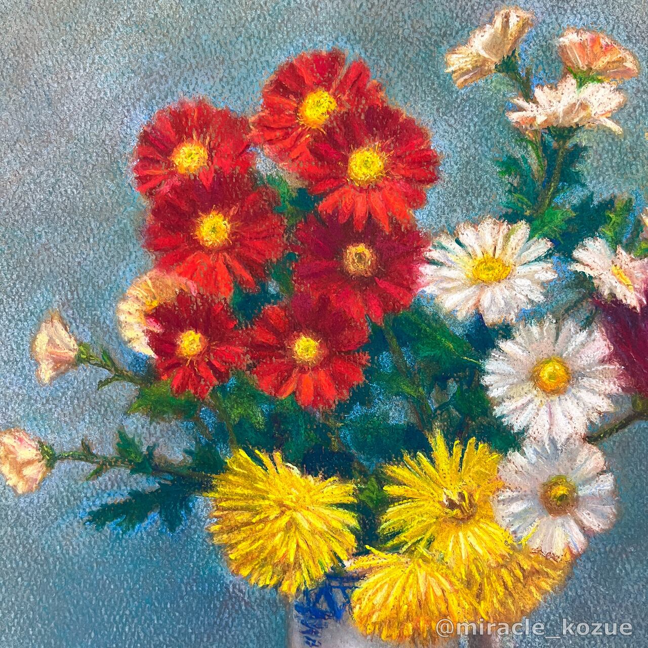 お近くの方が、お家の庭で摘んだ菊の花束を下さいました。とても嬉しくて、その日からパステルで描き始めました。