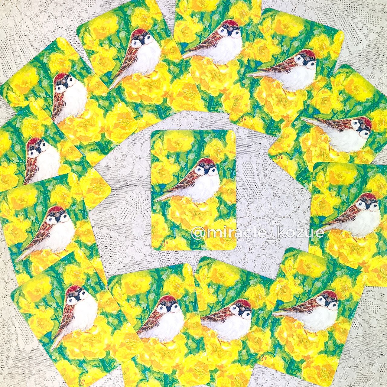 ⚫︎オイルパステルで描いた作品『スズメと菜の花』を元に、メッセージカードを作りました。